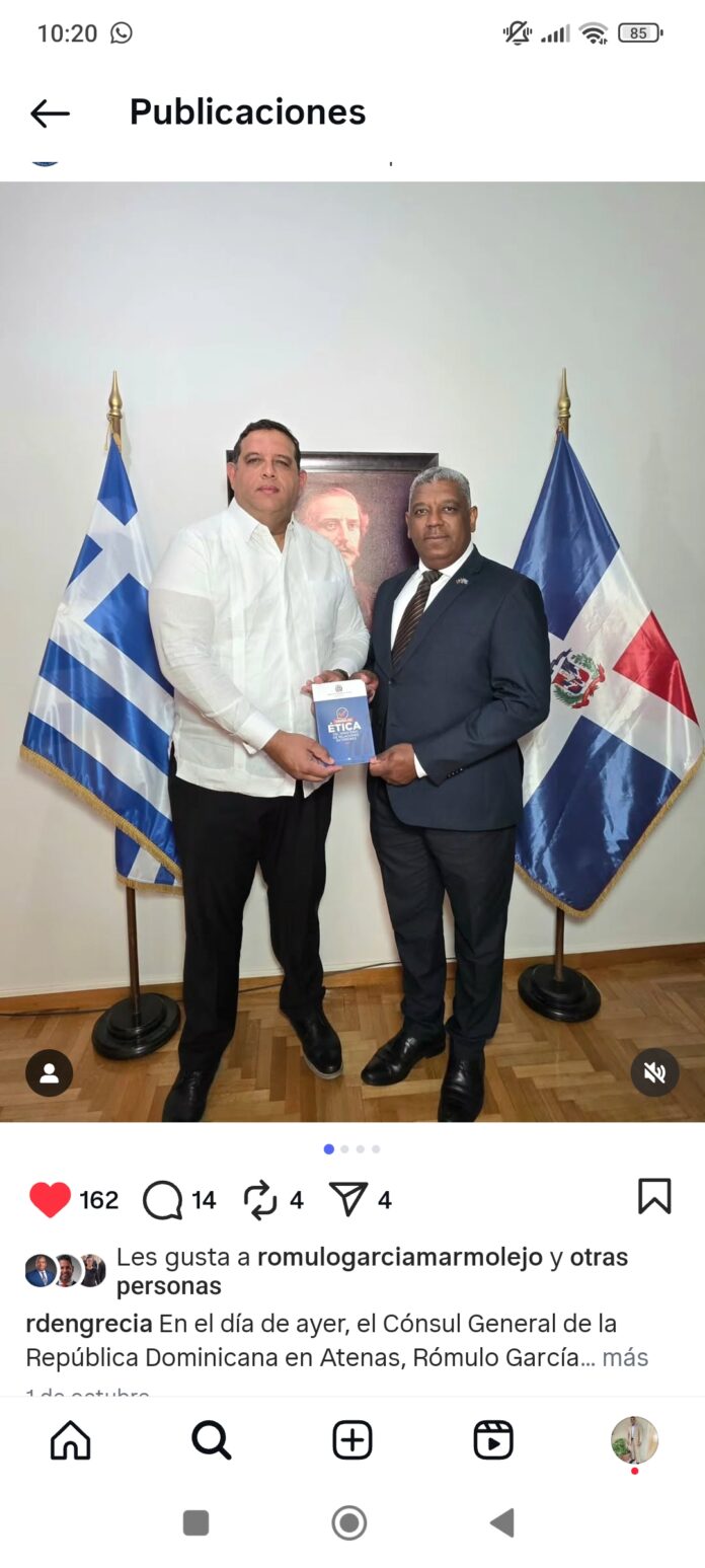 Atenas, Grecia. – En el marco del fortalecimiento institucional y la promoción de los valores éticos en la función pública, el cónsul general de la República Dominicana en Grecia, Rómulo García Marmolejo, sostuvo una reunión de trabajo con el director de Ética y Transparencia del Ministerio de Relaciones Exteriores (MIREX), sr. Alejandro Inoa.